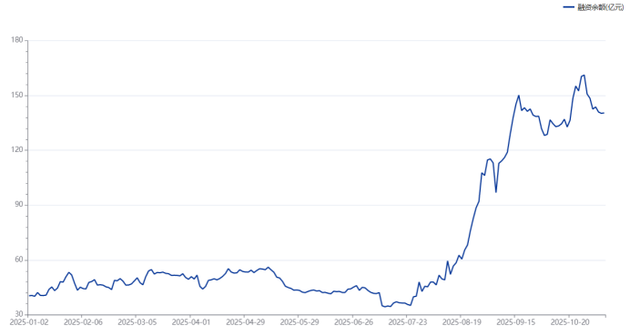 从资金面来看,寒武纪近期的融资余额规模仍在继续下降。截至11月5日数据,其目前融资余额140.45亿元,较近期高点(10月27日)共减少近20.7亿元,降幅接近12.9%。其中,寒武纪在10月28日遭融资客减持10.39亿元,融资净卖额位居历史第二高,仅低于今年9月4日(16.26亿元)。若从全年行情上看,其目前融资余额规模仍处于高位水平。