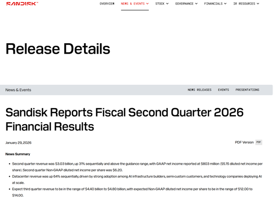 财报显示,闪迪第二财季销售额达30.3亿美元,同比增长61%;经调整后每股收益为6.20美元,同比增长404%;