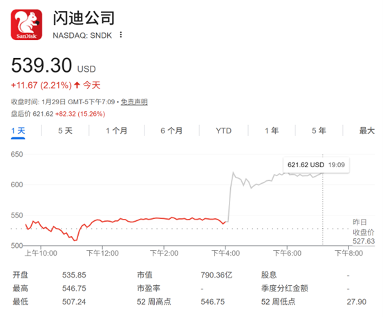 受上述消息影响,闪迪股价周四盘后大涨逾15%。当日常规交易时段,闪迪公司的股价上涨 2.2%,收于539.30美元,盘中一度创下546.75美元的纪录新高。
