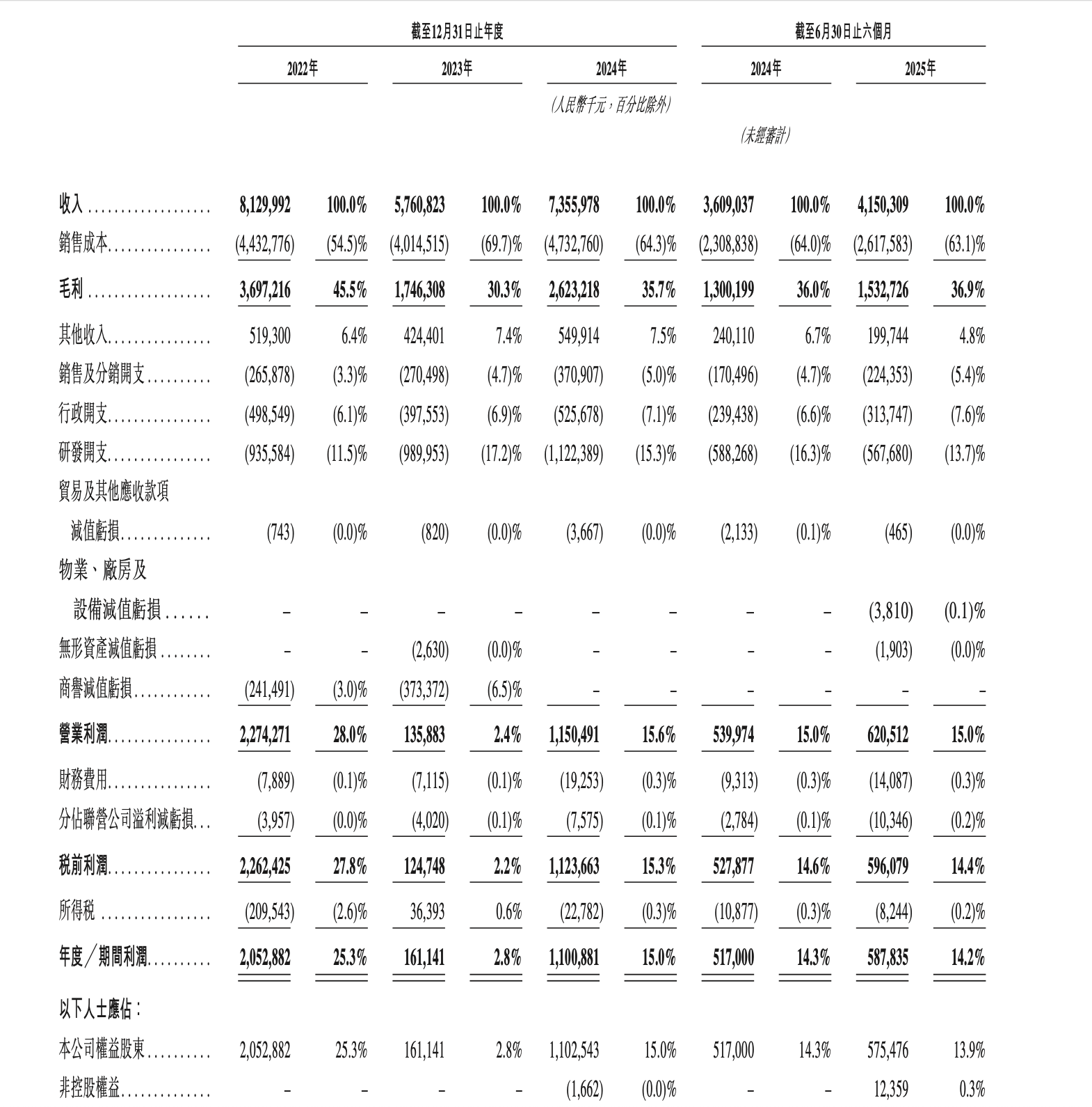 该公司通过港股聆讯后发布的招股书(下称:“招股书港股聆讯后版本”)显示,其2022年度至2024年度及2025年上半年的营收分别为81.3亿元、57.61亿元、73.56亿元、41.5亿元;毛利分别为37亿元、17.46亿元、26.23亿元、15.33亿元;上述同期的营业利润分别为22.74亿元、1.36亿元、11.5亿元、6.2亿元。