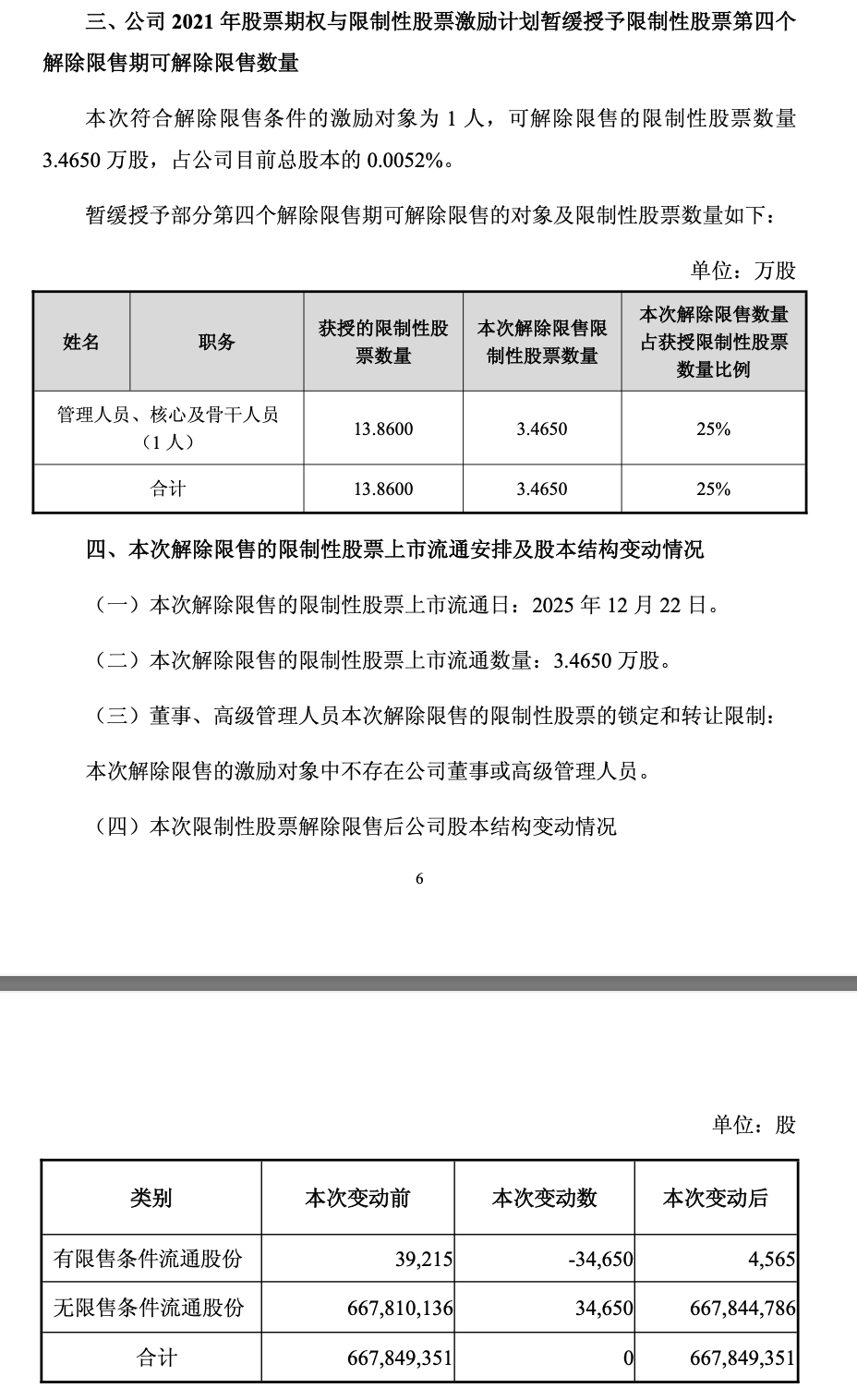 兆易创新亦于12月16日晚发布股票期权与限制性股票激励计划解除限售暨上市公告称,涉及1名管理人员/核心及骨干人员的限售股份即将解禁上市。本次股票上市流通总数为3.465万股,本次股票上市流通日期为2025年12月22日。