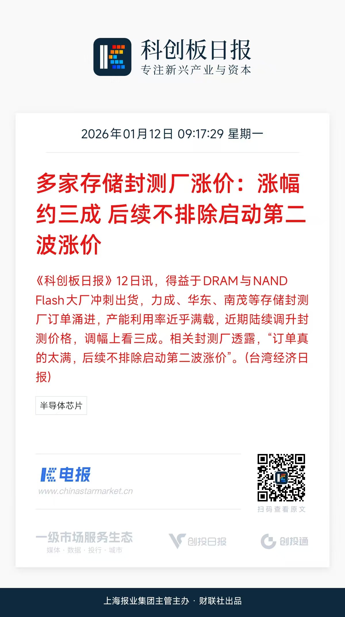 《科创板日报》1月12日曾报道,得益于DRAM与NAND Flash大厂冲刺出货,力成、华东、南茂等存储封测厂订单涌进,产能利用率近乎满载,近期陆续调升封测价格,调幅上看三成,且“后续不排除启动第二波涨价”。