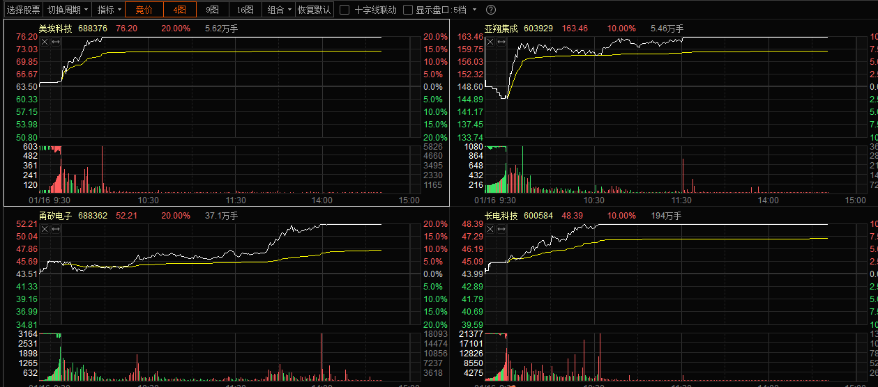 《科创板日报》1月16日讯(编辑 宋子乔) 今日,A股半导体产业链集体走强,其中,封测板块,长电科技涨停创5年多新高,甬矽电子、通富微电、太极实业、康强电子等涨停;洁净室板块,美埃科技、亚翔集成、圣晖集成、柏诚股份等涨停。