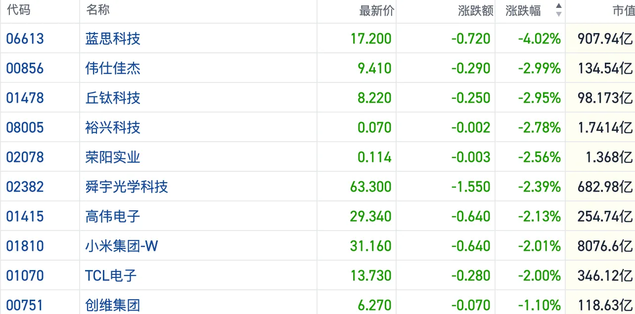 AI“抢食”供应链引发挤兑效应 港股消费电子概念短线承压