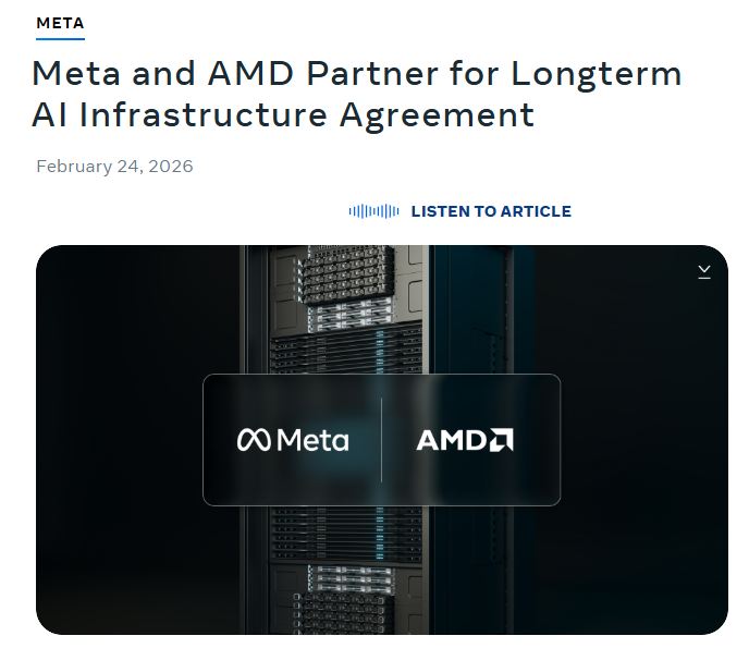 2月24日讯(编辑 赵昊)周二(2月24日)美股盘前,Meta和AMD双双在官网宣布扩大战略合作伙伴关系,Meta将部署6吉瓦AMD的Instinct GPU。