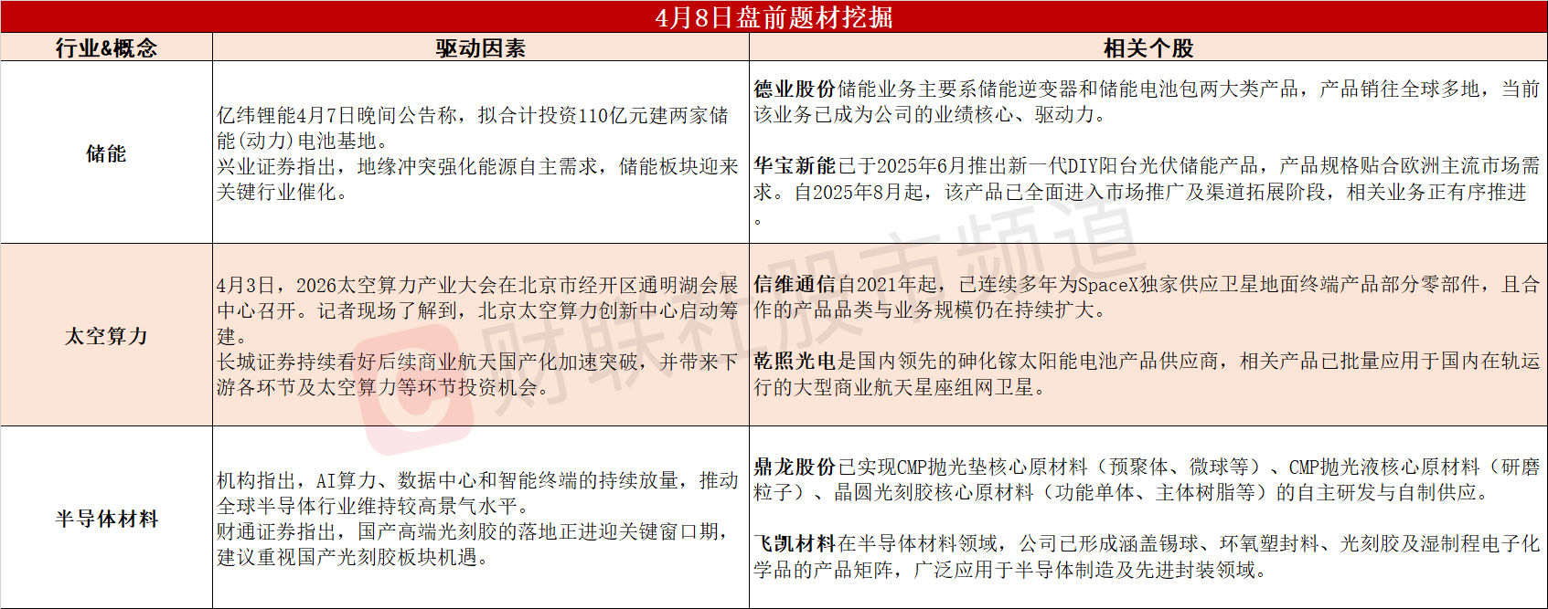 【盘前题材挖掘】①千亿龙头豪掷110亿扩产,储能行业迎来发展黄金期。②海内外加码布局太空算力,产业链各环节迎投资机遇。③AI需求持续放量,推动半导体材料领域景气上行。