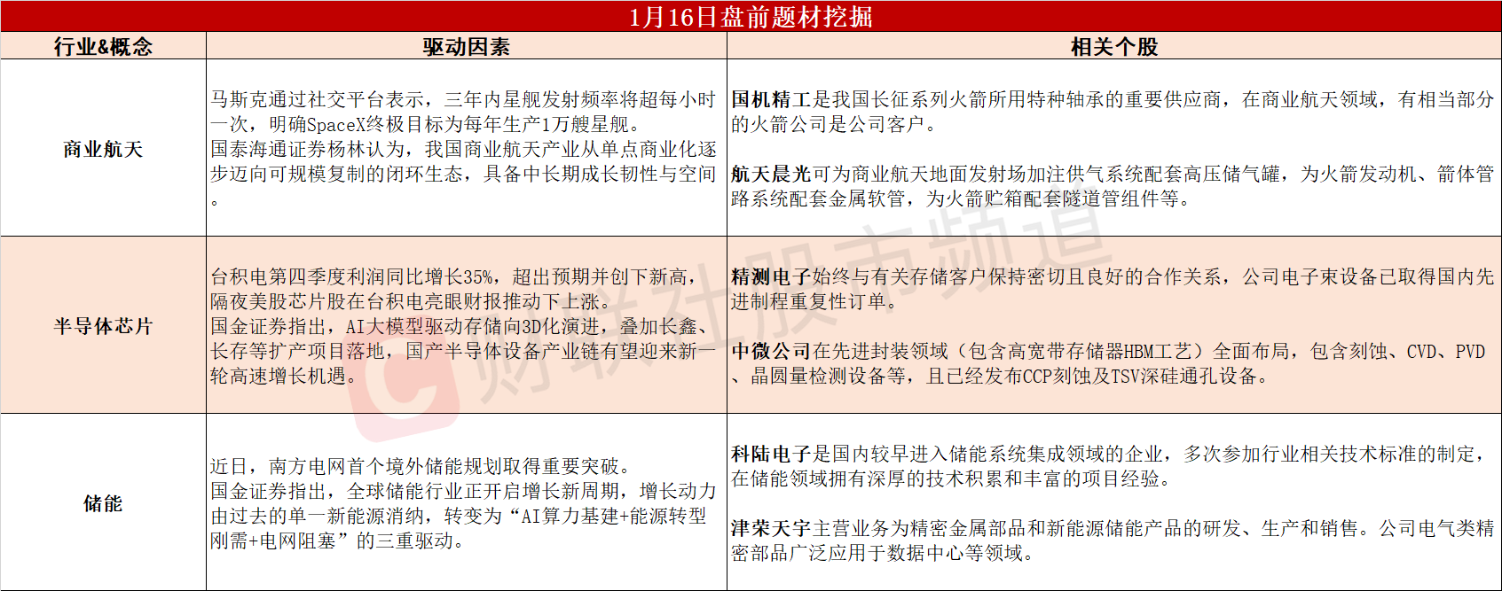 【盘前题材挖掘】①马斯克明确要每年生产1万艘星舰飞船,商业航天中长期成长空间巨大。②台积电亮眼财报推动美股芯片股大涨,半导体产业链有望迎新一轮增长机遇。③AI基建+能源转型+电网阻塞三重驱动,储能行业开启增长新周期。