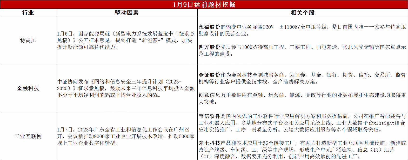 【盘前题材挖掘】①国家能源局打造“新能源+”模式,特高压或迎投资建设高峰;②金融领域改革显著加速,证券IT厂商均有望受益;③广东拟推5000家规上工业企业数字化转型,工业互联网有望驶入发展快车道。