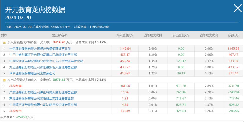 开元教育盘后公布的三日榜数据显示,龙虎榜资金净卖出259.92万元。两家机构分别位于卖一和卖五席位,分别净卖出631.7万元和286.95万元。
