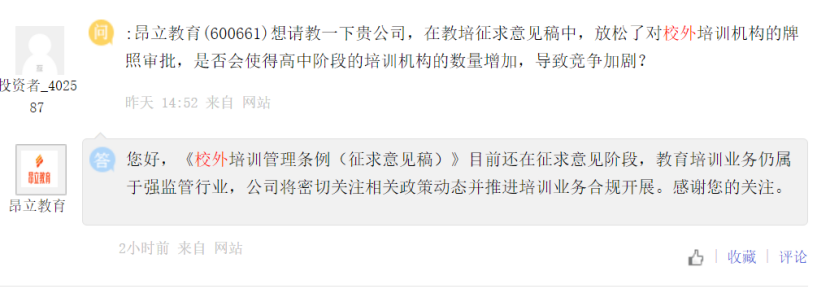 昂立教育盘后互动平台上表示,《校外培训管理条例(征求意见稿)》目前还在征求意见阶段,教育培训业务仍属于强监管行业,公司将密切关注相关政策动态并推进培训业务合规开展。