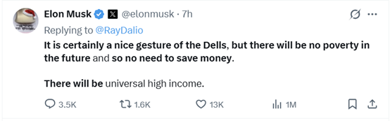“戴尔夫妇的举动无疑是善举,但未来将不再有贫困,因此存钱也会失去意义。届时,全民高收入时代终将到来。”马斯克在其社交平台X上发文称。