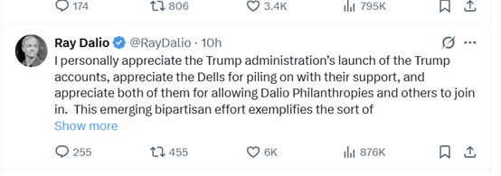 马斯克是在回复桥水基金创始人、投资大师雷·达里奥的帖子时作出这一表态的。达里奥在X帖中宣布,他将跟随迈克尔和苏珊·戴尔夫妇,为 “特朗普账户” 捐赠启动资金。