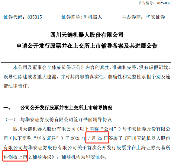 7月30日,天链机器人董事会发布公告,公告称,公司与华安证券于7月25日签署了《四川天链机器人股份有限公司与华安证券股份有限公司关于首次公开发行股票并在上海证券交易所科创板上市之辅导协议》,辅导机构为华安证券。