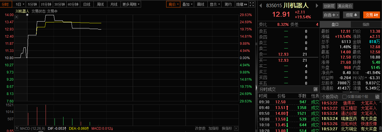 《科创板日报》7月31日讯(编辑 宋子乔) 7月31日,新三板公司四川天链机器人股份有限公司(证券简称川机器人,代码835015,该公司曾用名“四川福德机器人股份有限公司”,以下简称“天链机器人”)股价跳空高开,截至发稿涨近19%。