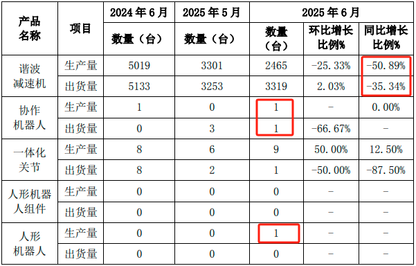 但最新出货数据显示,该公司的机器人整机产品尚未形成规模,无论是产量还是出货量都以个位数计,其中人形机器人产品尚未出货。2025年6月,天链机器人仅生产一台人形机器人、出货一台协作机器人,其主打产品是谐波减速机,主要用于SCARA机器人、协作机器人、服务机器人、人形机器人,但该产品的产量和出货量受客户需求和提货影响均有所下滑。6月,其谐波减速机的产量同比下降50.89%、出货量同比下降35.34%;一体化关节的出货量同比大降87.50%。