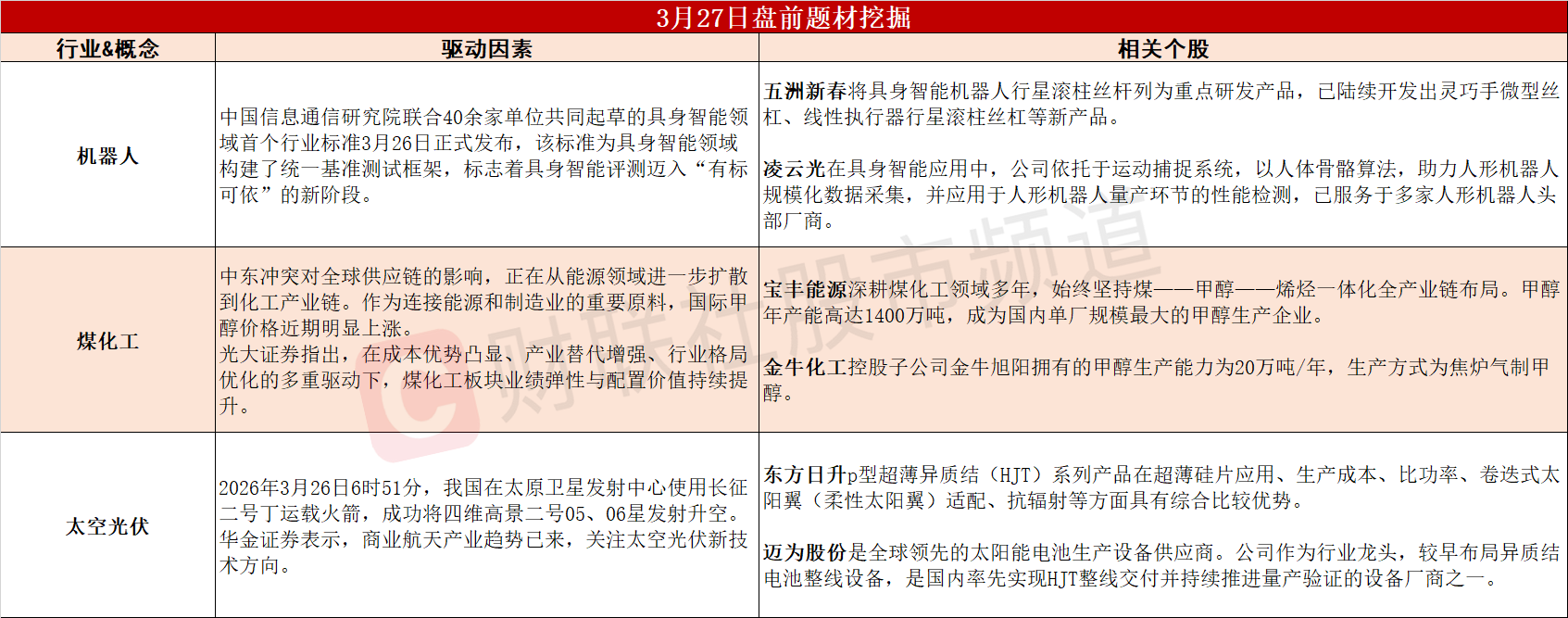 【盘前题材挖掘】①具身智能领域首个行业标准发布,机器人产业链或爆发在即。②中东冲突影响扩散到化工产业链,煤化工板块业绩弹性有望释放。③商业航天产业趋势已来,太空光伏新技术方向有望突围。
