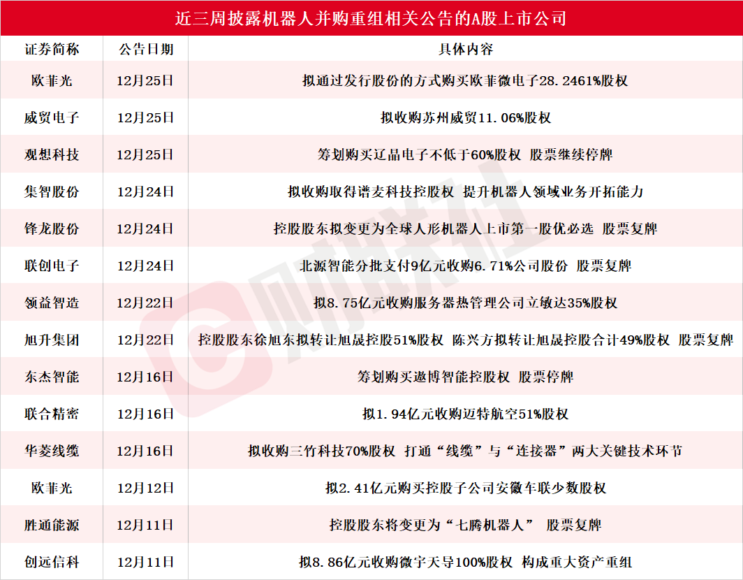【十余家A股机器人上市公司近三周披露并购重组最新公告 胜通能源控股股东拟变更为七腾机器人 锋龙股份控股股东拟变更为优必选】财联社12月28日电,据财联社不完全统计,截至发稿,近三周(12月11日-12月28日)包括欧菲光、威贸电子、观想科技、集智股份、锋龙股份、联创电子、领益智造、旭升集团、东杰智能、联合精密、华菱线缆、胜通能源、创远信科在内的13家A股机器人上市公司披露并购重组进展最新公告。其中,锋龙股份周三晚公告,全球人形机器人上市第一股优必选拟16.65亿元收购公司,同时成为公司控股股东,
