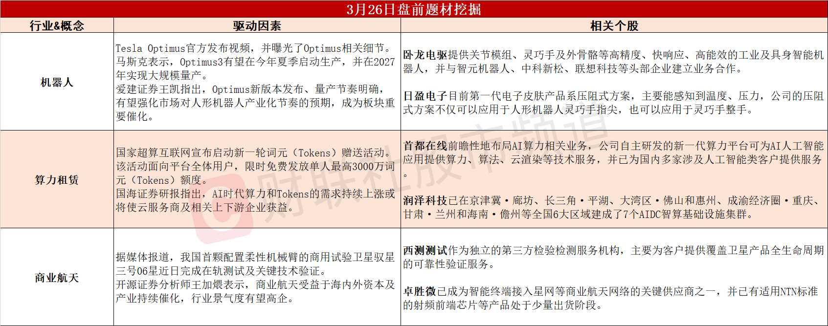 【盘前题材挖掘】①特斯拉机器人有望在今夏启动生产,机器人板块迎重要催化。②国家超算互联网启动词元赠送活动,云服务商成长空间有望打开。③我国“太空加油站”完成在轨测试,商业航天行业景气度或持续提升。