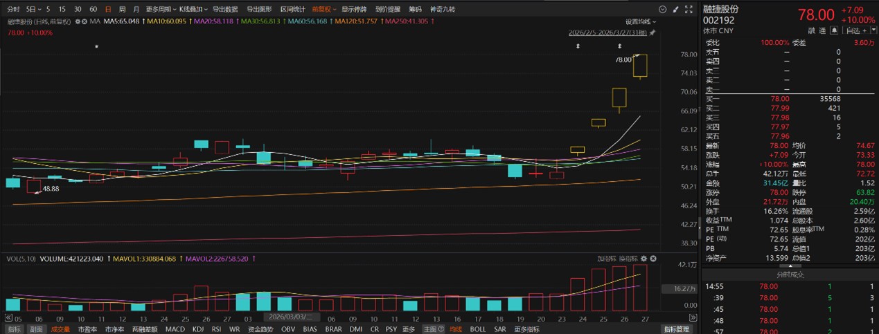 市场表现看,锂电池概念股本周表现活跃。融捷股份周四发布机构调研纪要表示,公司2025年度通过矿山自选和委外加工共产出锂精矿18.56万吨,2026年公司锂矿采选业务将深化提质增效措施,持续提升产出规模,实现业绩持续向好。二级市场上,融捷股份周五收盘录得4连板。