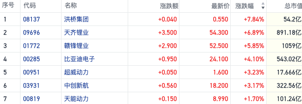 6月1日讯(编辑 马轶杰)锂业港股今日集体走高,截至发稿,洪桥集团(08137.HK)涨近8%,天齐锂业H股(09696.HK)涨近7%,赣锋锂业H股(01772.HK)涨近6%,比亚迪电子(00285.HK)涨超4%、中创新航(03931.HK)涨超3%。