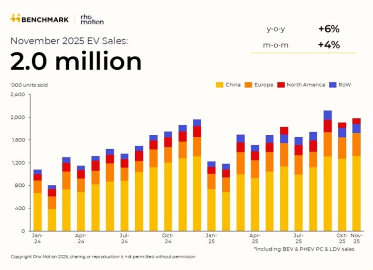 数据显示,今年11月,全球电动汽车的注册量(作为销量的指标)同比增长6%,达到约200万辆。