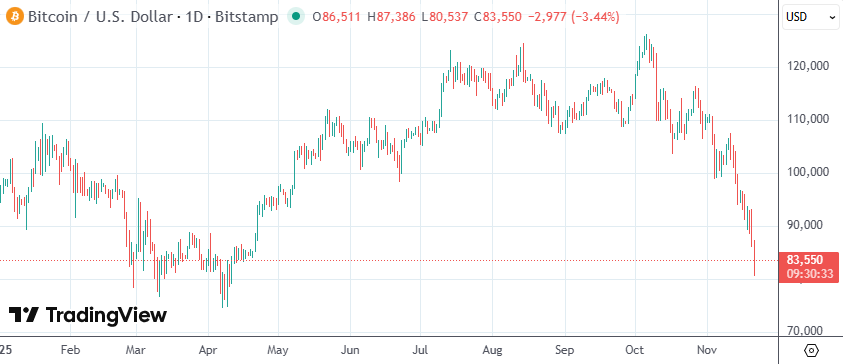 11月21日讯(编辑 赵昊)据Bitstamp报价,周五(11月21日),比特币一度跌至80537美元,为4月份以来的最低水平; 现反弹至83572美元,近24小时的跌幅接近8.5%,以太坊、瑞波币则跌超9%。