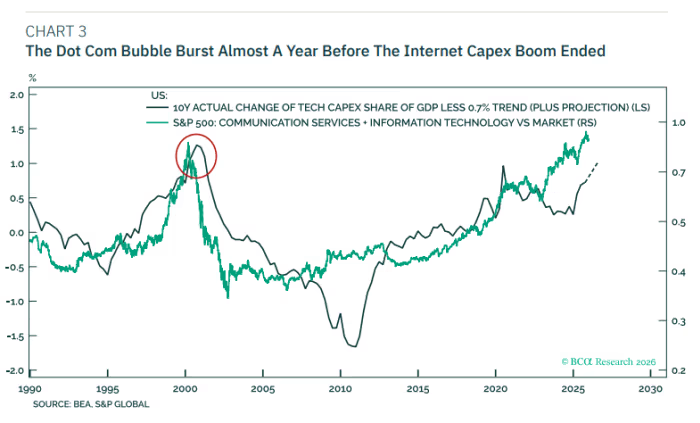但BCA Research旗下Counterpoint的首席策略师Dhaval Joshi对此表示怀疑。他在最新报告中指出,以史为鉴,人工智能领域的投资热潮很可能在今年结束。但对股市多头来说,也有好消息,即他认为这次的情况不会像2000年互联网泡沫破裂那样“剧烈”。