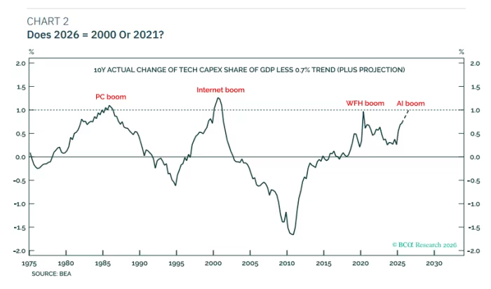 有鉴于此,Joshi认为,2026 年与2021年的相似之处远多于与2000年的相似之处,并预计最有可能出现的情况是: