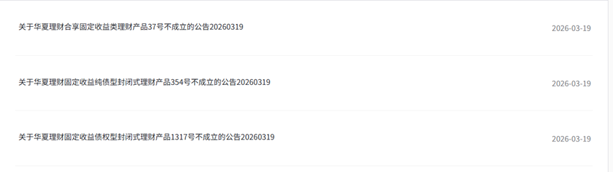 3月20日讯(编辑 王蔚)近期,华夏理财发布旗下多只理财产品不成立的公告。