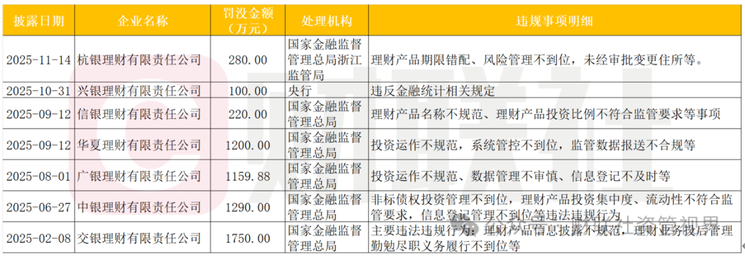 据此前不完全梳理统计,银行理财子公司近年来面临较多处罚, 2025年,有7家机构收到监管罚单,从处罚金额来看,部分罚单达到千万级别。如下图所示: