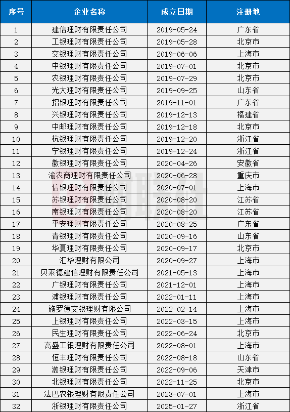 《办法》适用开业满一个完整会计年度以上的理财公司。目前,32家理财公司开业均在一个完整会计年度以上。如下图所示: