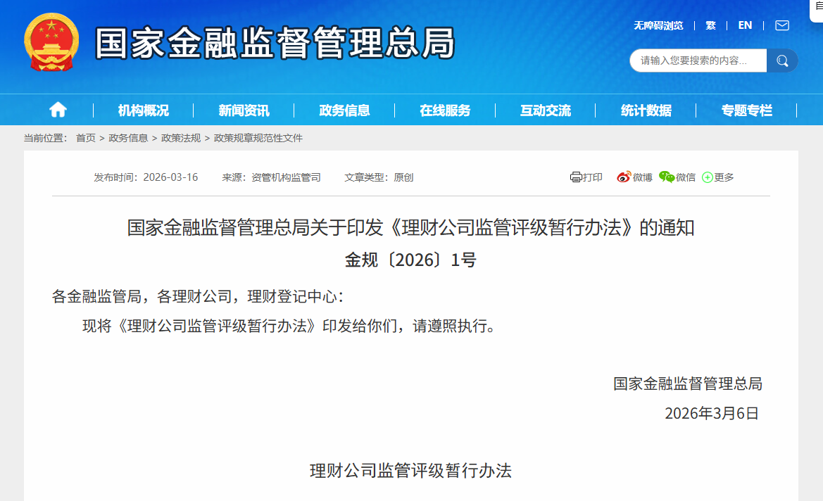 3月16日讯(编辑 王蔚)刚刚,国家金融监督管理总局下发《理财公司监管评级暂行办法》的通知(金规〔2026〕1号,以下简称《办法》)。