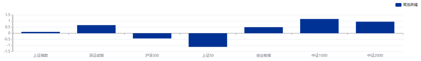 上周,部分权益指数走势分化。其中,上证指数上涨0.11%,深证成指上涨0.67%,沪深300下跌0.43%,上证50下跌1.12%,创业板指上涨0.5%。而中证1000、2000分别上涨1.18%、0.95%。上周,化工、电新、计算机、有色板块涨幅居前,通信、银行等板块下跌。