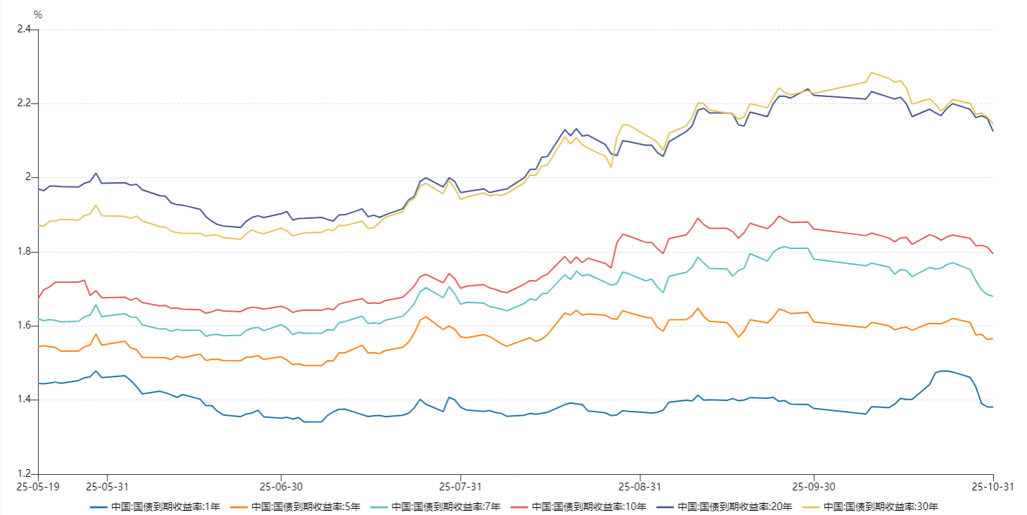 上周,主要利率债收益率震荡下行。截至10月31日收盘,1Y、5Y、7Y国债分别报收1.38%、1.57%、1.68%,分别较前一周收盘变动-9BP、-5BP、-9BP;10Y、20Y、30Y国债分别报收1.79%、2.13%、2.15%,分别均较前一周收盘变动-5BP、-8BP、-7BP。
