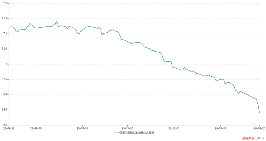 据wind统计数据,2025年12月底,人民币兑美元汇率突破“7”大关,此后持续攀升。春节后的3个交易日,人民币兑美元即期汇率已从6.8879升至6.8394,创下2023年4月以来新高。近月来美元兑人民币即期汇率如下图所示: