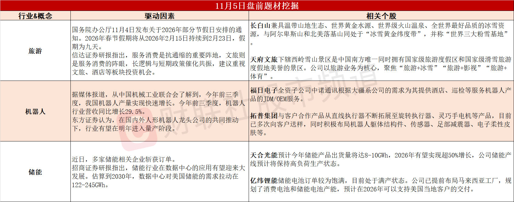 ①国务院办公厅11月4日发布关于2026年部分节假日安排的通知。2026年春节假期将从2026年2月15日持续到2月23日,假期为九天。 ②信达证券研报指出,服务消费是抗通缩的重要阵地,文旅则是服务消费的阵眼,长逻辑与短期政策催化共振,建议重视文旅、酒店等板块投资机会。