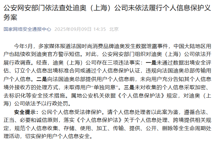 9月9日讯,据国家网络安全通报中心9日消息,今年5月,多家媒体报道法国时尚消费品牌迪奥发生数据泄露事件,中国大陆地区用户也陆续收到迪奥官方警示短信。对此,公安网安部门组织对迪奥(上海)公司依法开展行政调查。经查,迪奥(上海)公司存在三项违法事实: