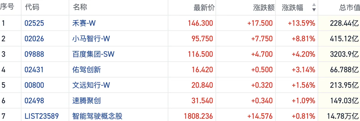 截至发稿,激光雷达龙头禾赛-W(02525.HK)涨超13%,Robotaxi企业小马智行-W(02026.HK)涨近9%,百度集团-W(09888.HK)等相关个股也明显跟涨。