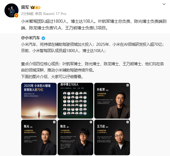 今日早间,小米雷军转发小米汽车最新发文并表示,小米智驾团队超过1800人,博士达108人。叶航军博士总负责,陈光博士负责端到端,陈龙博士负责VLA,王乃岩博士负责L3项目。