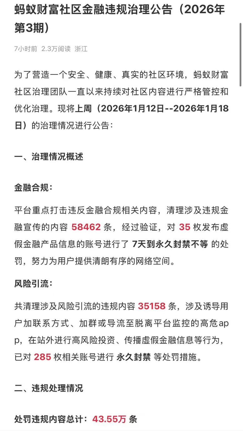 蚂蚁财富定期公告社区金融违规治理公告,最新一期显示,今年1月12日至18日当周治理数据上,在金融合规方面,平台重点打击违反金融合规相关内容,清理涉及违规金融宣传的内容58462条,经过验证,对35枚发布虚假金融产品信息的账号进行了7天到永久封禁不等的处罚。