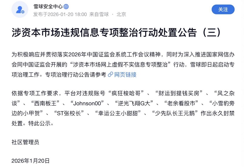 1月20日,雪球安全中心连发三则涉资本市场违规信息专项整治行动处置公告,三批共计22个活跃大V账号被永久封禁。