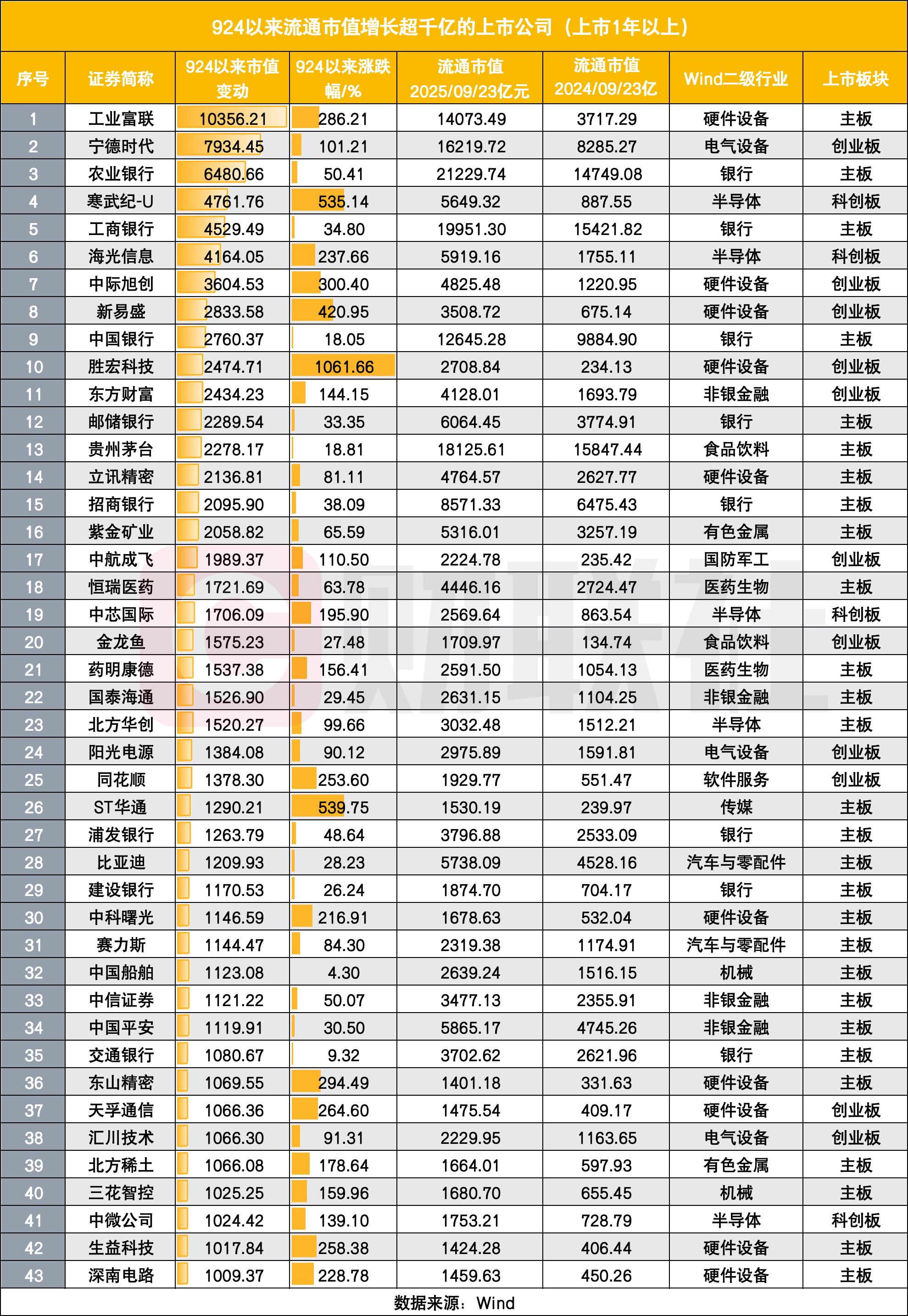 数据显示,924以来截至2025年9月23日,短短一年时间内,共有43家上市公司(上市一年以上)的流通市值增长超过1000亿元人民币,合计增长规模逾9.5万亿元。