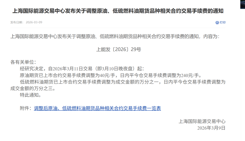 至于手续费的调整,3月10日晚夜盘时起,原油期货已上市合约交易手续费调整为40元/手,日内平今仓交易手续费调整为240元/手。