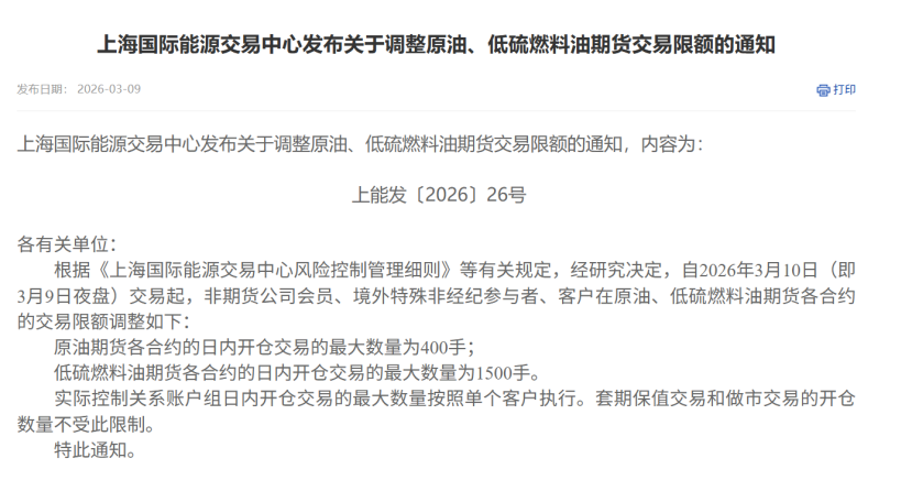 原油、低硫燃料油、燃料油期货还对交易限额进行进一步限制。从今晚夜盘开始,非期货公司会员、境外特殊非经纪参与者、客户在原油期货各合约的日内开仓交易的最大数量为400手; 低硫燃料油期货各合约为1500手;燃料油期货为1500手。