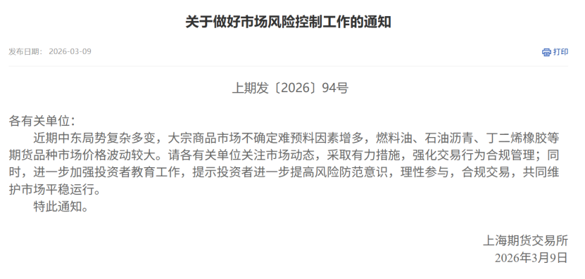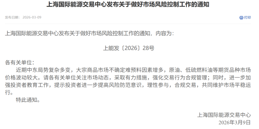 上期所及旗下上期能源发布关于做好市场风险控制工作的通知提到,近期中东局势复杂多变,大宗商品市场不确定难预料因素增多,原油、低硫燃料油、燃料油、石油沥青、丁二烯橡胶等期货品种市场价格波动较大。