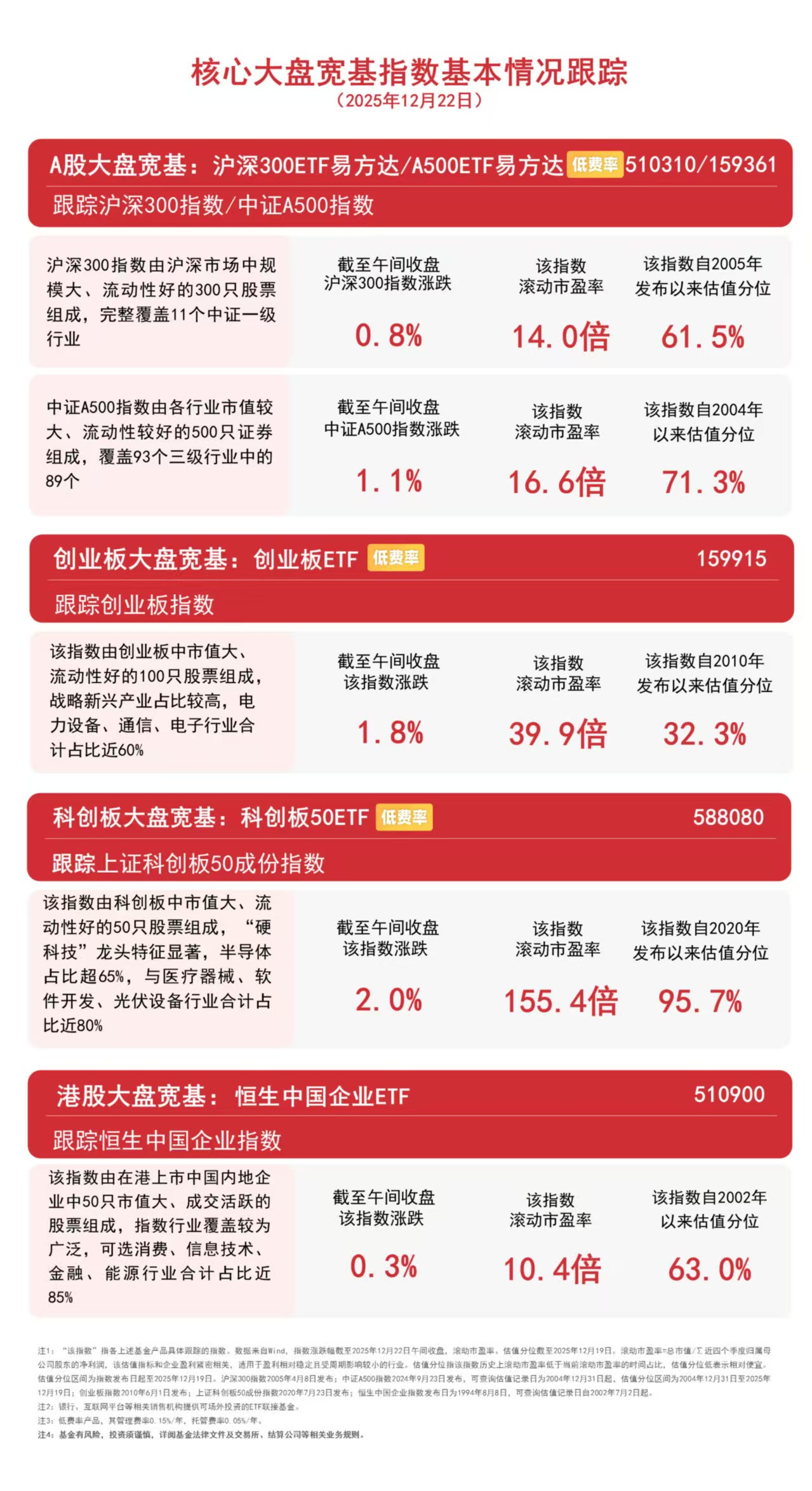 【沪指涨0.64%再次站上3900点,关注A500ETF易方达(159361)、沪深300ETF易方达(510310)投资价值】 今日早盘,A股三大指数集体走强,沪指涨0.64%再次站上3900点,全市场近3500只个股飘红。板块题材上,海南、存储芯片、贵金属板块活跃,医药商业、影视院线板块调整;港股表现分化,半导体概念股领涨,汽车、机器人、软件等板块涨幅居前,医药、高股息板块走弱。截至午间收盘,中证A500指数上涨1.1%,沪深300指数上涨0.8%,创业板指数上涨1.8%,上证科创板50成份