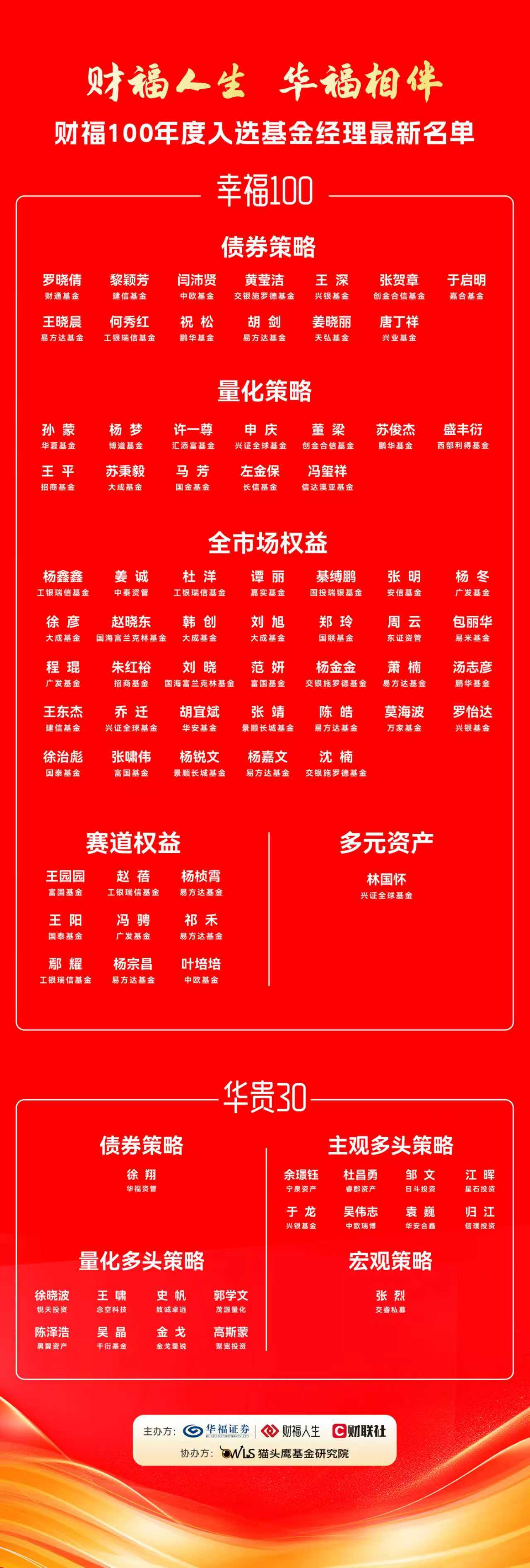 【华福证券“财福人生”品牌2025年度成果璀璨绽放】 财联社12月23日电,华福证券“财福人生”品牌2025年成果丰硕,四大子品牌齐头并进。财福100精选基金经理持续高胜率,幸福100基金投顾(筹)蓄势待发,华贵30 私募FOF规模从无到有突破32亿元;财福智享AI赋能显著,智算签约客户超1.6万户,构建智慧投资矩阵,AI财小福和AI小福牛深化AI融入客户旅程。财福同享以多客群、多方案、多资源全链路服务体系建设机构生态,累计合作机构1.4万户、服务上市公司超600家。财福乐享围绕客户服务场景,打