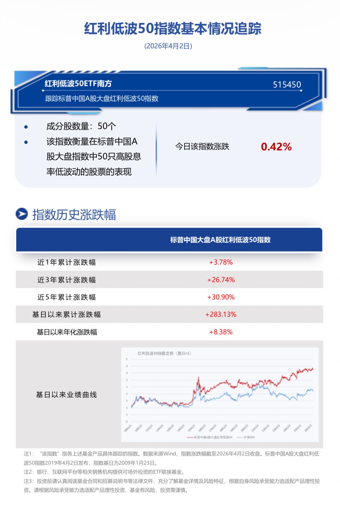 红利低波50ETF南方(515450.SH)跟踪标普中国A股大盘红利低波50指数,指数中在样本空间、行业分类等方面具备独特性,相比同类指数行业分布更加均衡、超配大消费板块,长期风险收益表现领先。截至2026年4月1日,据Wind,红利低波50股息率按整体法计算为4.45%,股息性价比仍存。