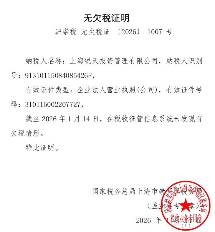 【百亿量化私募锐天投资被指欠税 公司澄清】财联社1月15日电,针对企查查披露的上海崇明区税务局公示欠缴421.81万元企业所得税,百亿量化私募锐天投资澄清,公司按时足额缴纳税款,不存在欠税行为。税务部门于2026年1月发出的欠税公告,系税局系统问题。收到欠税公告后,公司已向主管税务局出具所有完税证明,主管税局也已确认锐天不存在任何欠税行为。公司称,目前政府官方渠道已撤除该错误公示信息,企查查所显示内容或存在信息滞后。(财联社 封其娟)