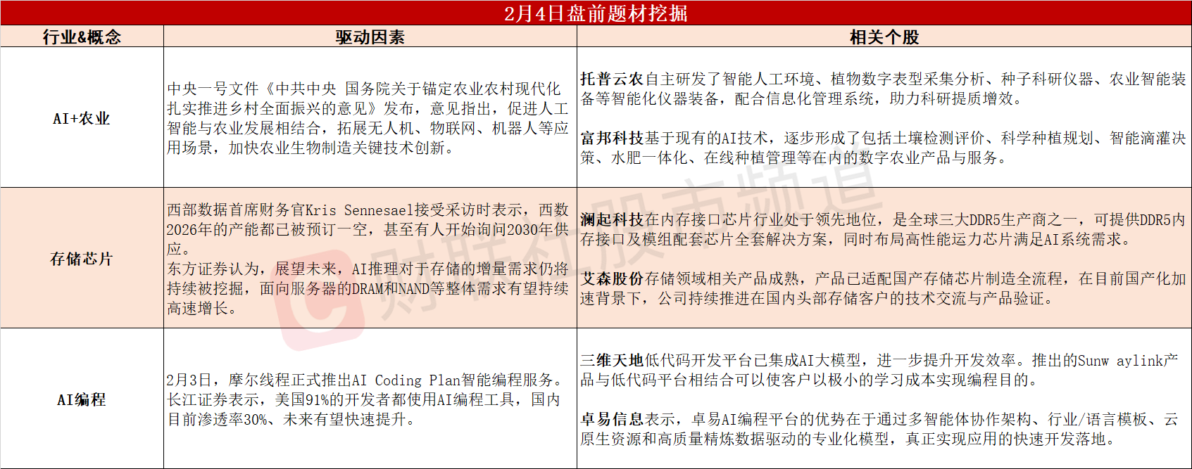 【盘前题材挖掘】①中央一号文件促进AI与农业发展相结合,AI赋能种植链前景可期。②西部数据称已有客户询问2030年供应,存储芯片紧缺与涨价态势或将延续。③摩尔线程推出国产智能编程服务,AI编程渗透率有望快速提升。